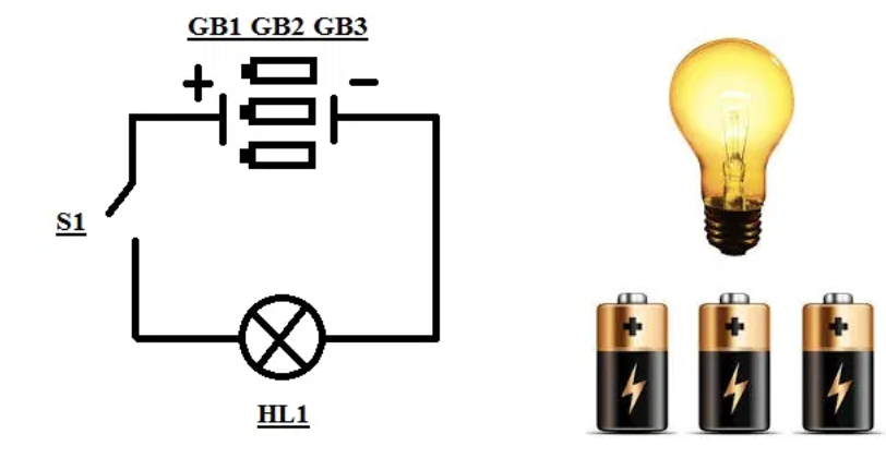 Где I – сила тока, U – напряжение, приложенное к участку цепи, а R – электрическое сопротивление участка цепи.Так, если известны две из этих величин можно легко вычислить третью.Понять закон Ома можно на простом примере. Допустим, нам необходимо вычислить сопротивление нити накаливания лампочки фонарике и нам известны величины напряжения работы лампочки и сила тока, необходимая для ее работы (сама лампочка, чтобы вы знали имеет переменное сопротивление, но для примера примем его как постоянное). Для вычисления сопротивления необходимо величину напряжения разделить на величину силы тока. Как же запомнить формулу закона Ома, чтобы правильно провести вычисления? А сделать это очень просто! Вам нужно всего лишь сделать себе напоминалку как на указанном ниже рисунке.Теперь закрыв рукой любую из величин вы сразу поймете, как ее найти. Если закрыть букву I, становится ясно, что чтобы найти силу тока нужно напряжение разделить на сопротивление.Теперь давайте разберемся, что значат в формулировке закона слова « прямо пропорциональна и обратно пропорциональна. Выражение «величина силы тока на участке цепи прямо пропорциональна напряжению, приложенному к этому участку» означает, что если на участке цепи увеличится напряжение, то и сила тока на данном участке также увеличится. Простыми словами, чем больше напряжение, тем больше ток. И выражение «обратно пропорциональна его сопротивлению» значит, что чем больше сопротивление, тем меньше будет сила тока.Рассмотрим пример с работой лампочки в фонарике. Допустим, что для работы фонарика нужны три батарейки, как показано на схеме ниже, где GB1 – GB3 – батарейки, S1 – выключатель, HL1 – лампочка.