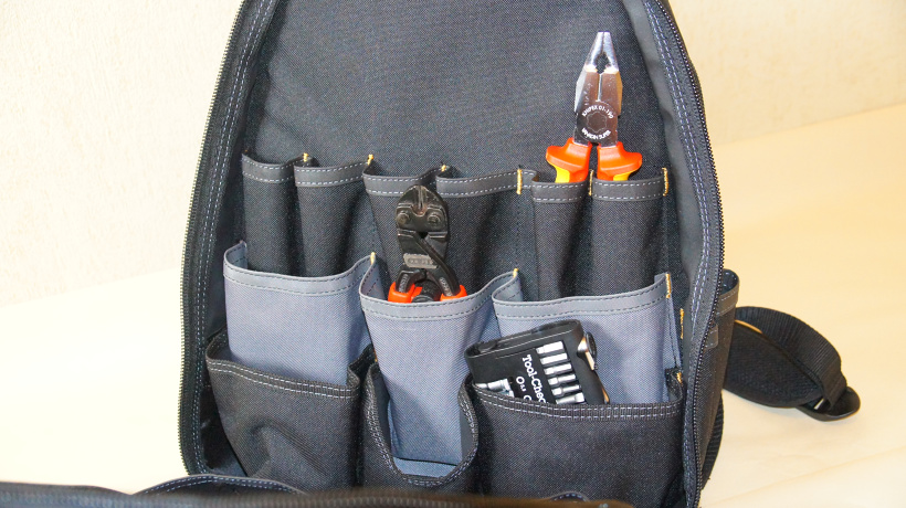 При этом во внутренних карманах внешней стороны располагается мелочевка, небольшой нивелир, в нижних карманах тестер и пара ножей.