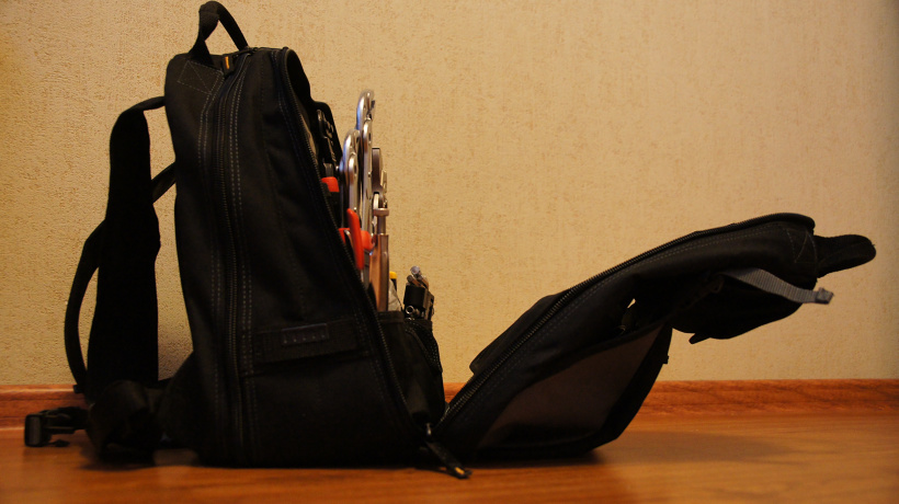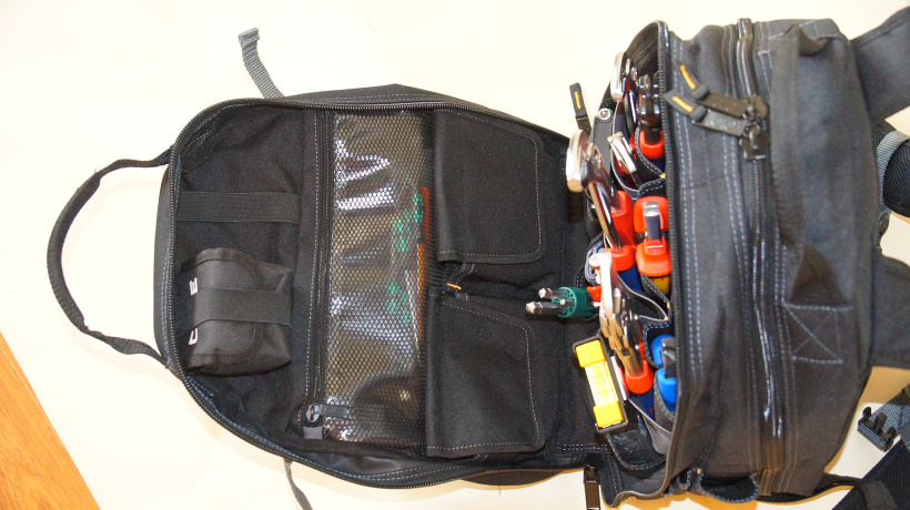 В экипированном состоянии с 12,250 кг инструмента при раскрытии первого отделения рюкзак за счет того, что в нижнем внешнем массивном кармане лежит моток провода внешняя стенка практически ложится на поверхность.