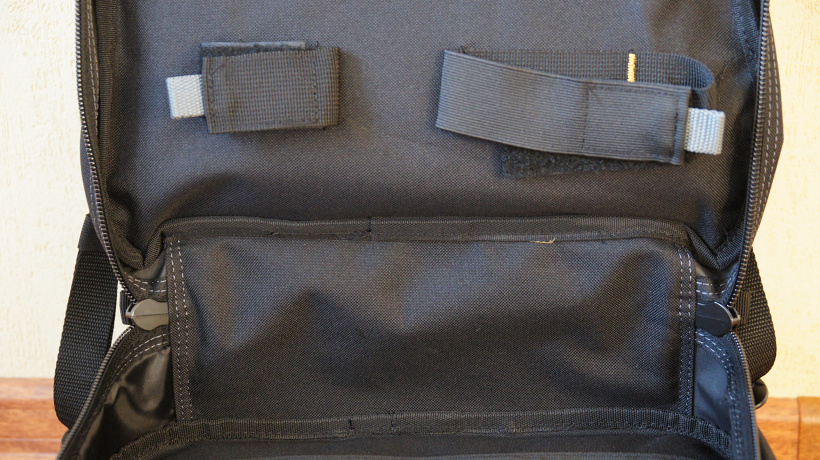 В верхней части первого отделения две эластичные лямки. В них хорошо помещается и держится что-нибудь среднего размера и веса, к примеру, ADA cube. Можно туда и компактную музыкальную систему поместить. Снизу два крупных кармана с клапанами на липучках.