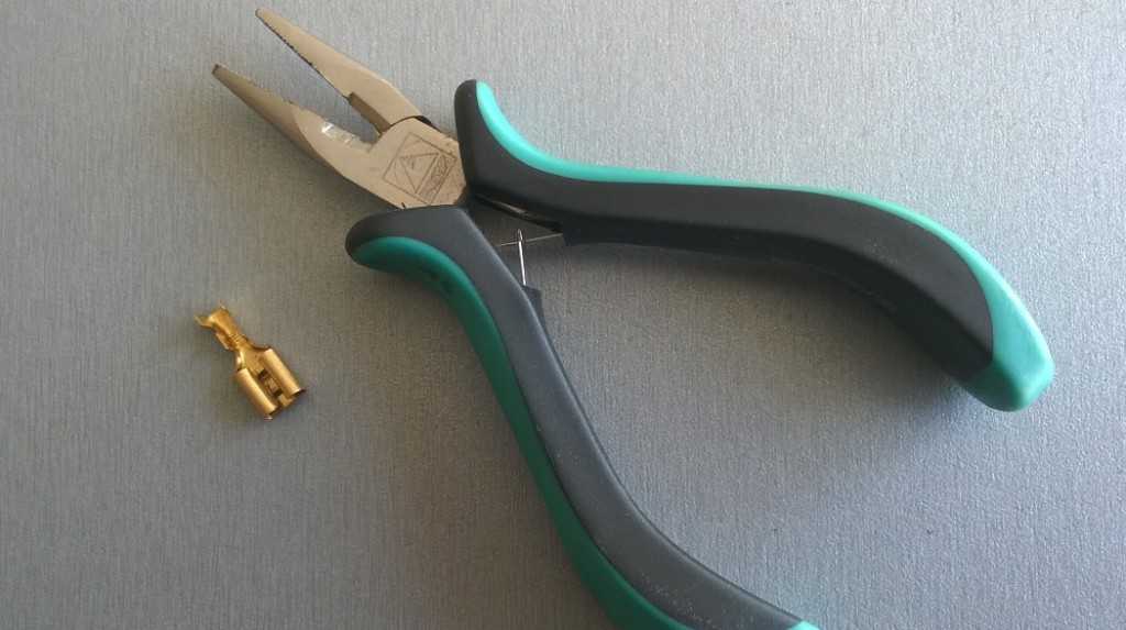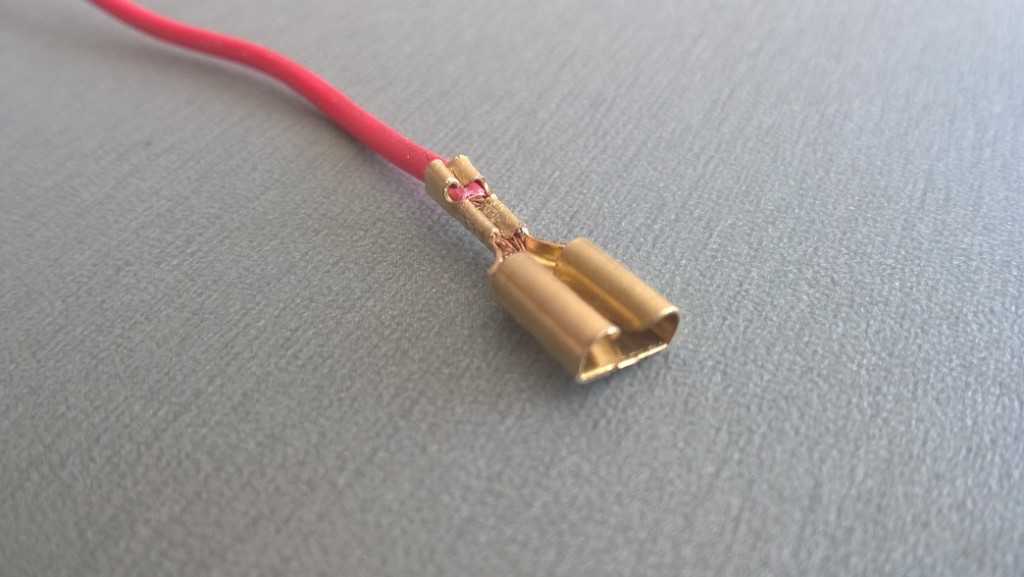 Получилось не так аккуратно, как кримпером, но тоже прочно и надежно. Для сравнения: верхняя клемма фиксировалась кримпером, а нижнюю мы только что обжали плоскогубцами.