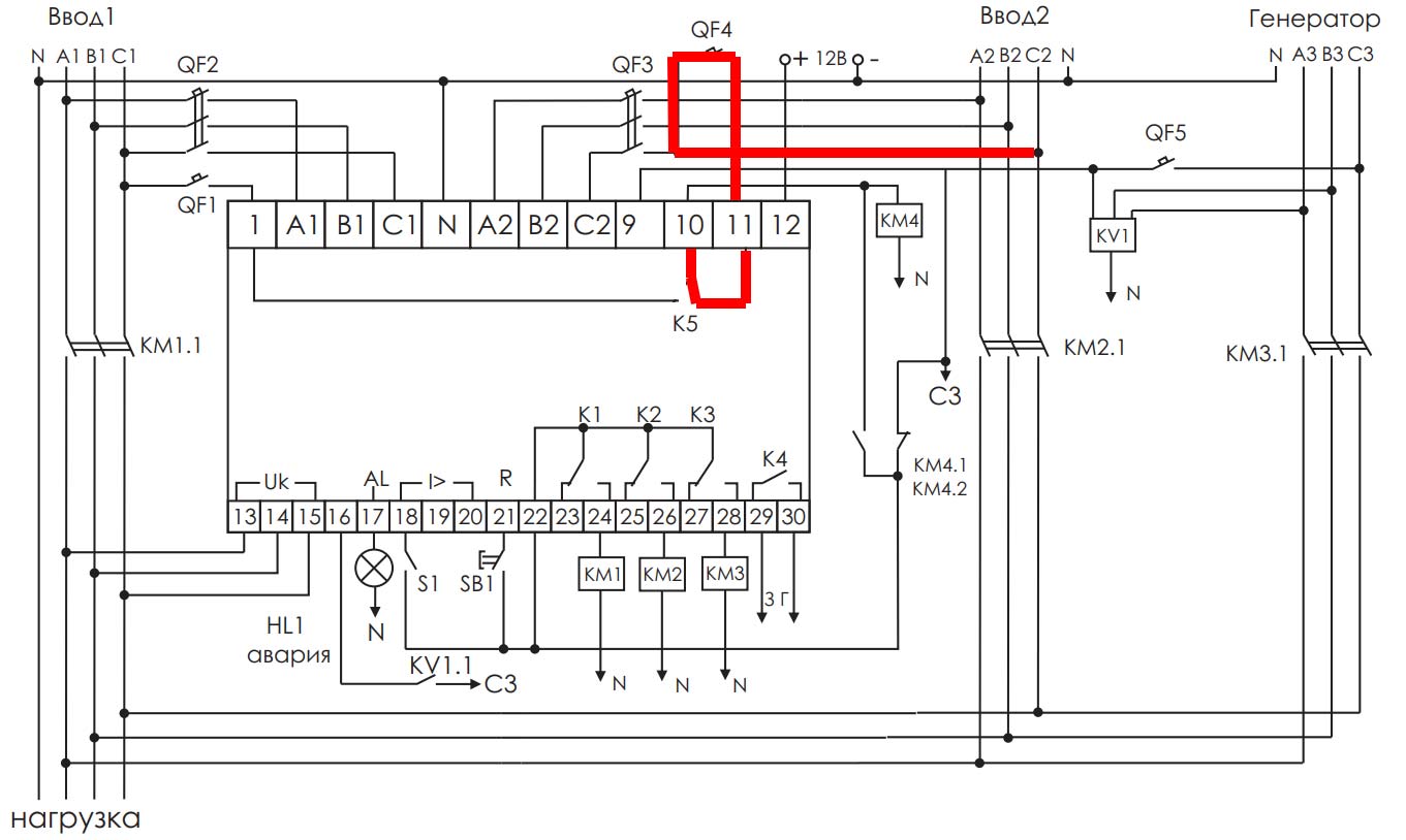 Контакт 1 и 11 формируют сигнал управления посредством реле К5. Данное реле К5, если уровень напряжения нормален на обоих вводах, должно включить ввод№1. То есть находится в том положении, как на изначальной схеме. Напряжение через него попадает на 10 контакт и идет до катушки КМ4. Это промежуточное реле. Его контакты обозначены КМ4.1 и КМ4.2
