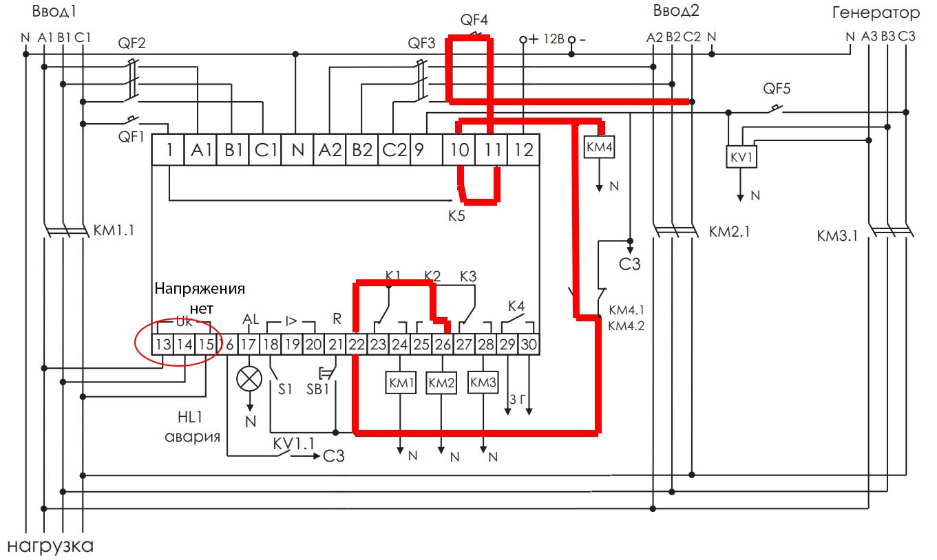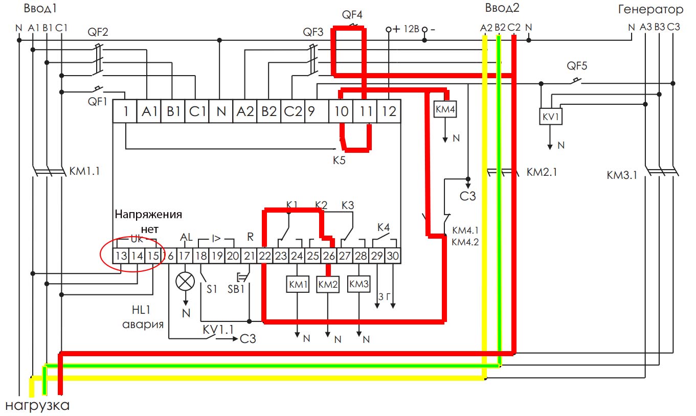 При этом устройство следит за тем, чтобы напряжение на №13,14,15 отсутствовало. Дабы не получилось встречного включения питания (при залипании контактов и восстановлении эл.снабжения).