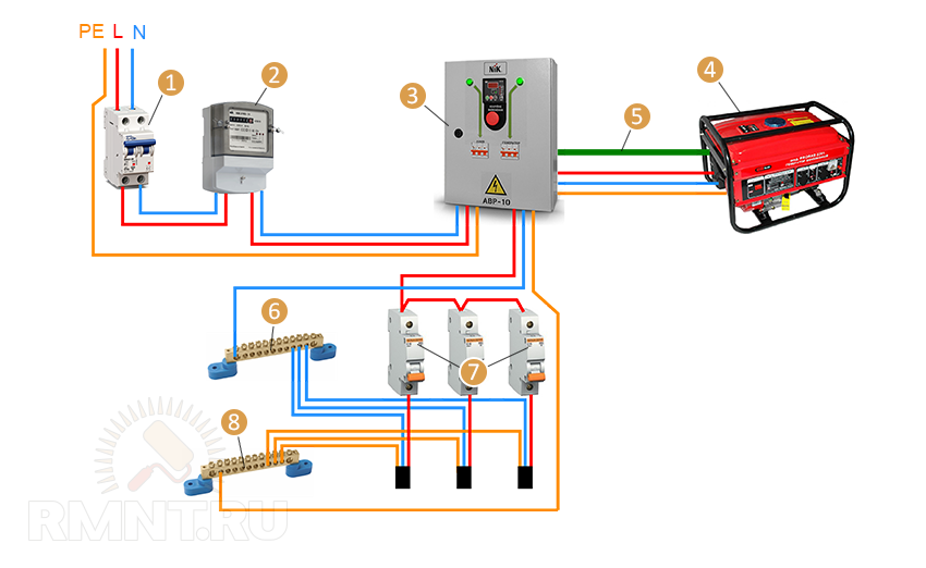 Подключение генератора через АВР: 1 — вводный автомат; 2 — счётчик; 3 — щит АВР; 4 — генератор; 5 — управляющий кабель; 6 — нулевая шина; 7 — автоматы потребителей; 8 — шина заземления