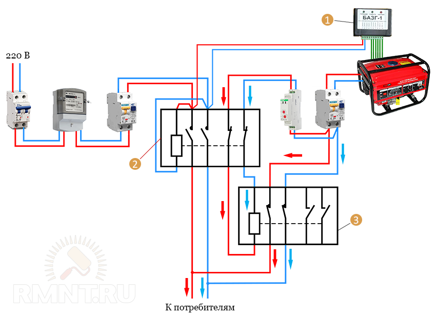 При пропадании основного источника, вы запускаете генератор и переключаете рубильником ввод электроэнергии. Это не очень комфортно, но подходит для редких перебоев в энергоснабжении.