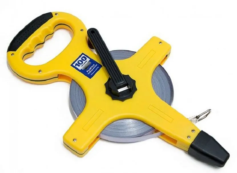 - Геодезические — их главная особенность в наличии длинной ленты от 10 метров. Представлены инструменты в виде бобины (есть и другие формы корпусов), с отверстием для подачи ленты из боковой части. Рукоятка предназначена для ручного сматывания полотна в катушку. Лента может изготавливаться не только из стали, но и стеклопластика. В качестве зацепа используется металлическое кольцо. Другое название этого прибора — землемерная рулетка