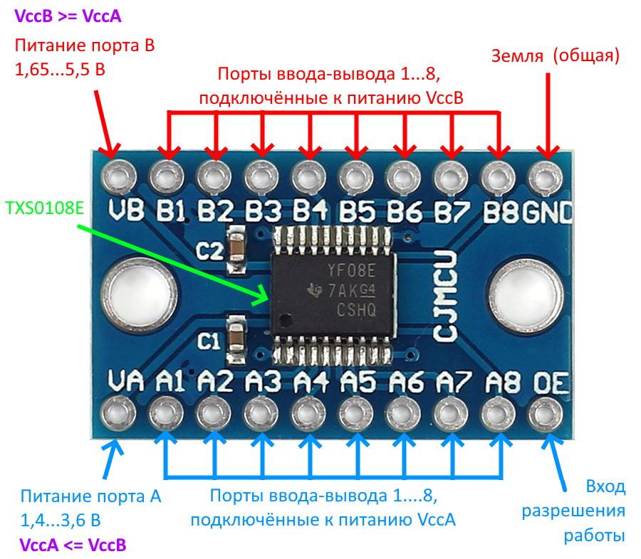 Здесь уже имеются 8 вводов-выводов. Причём к выводам со стороны порта A (A1…A8) должна подключаться низковольтовая логика, а к выводам B1…B8 – высоковольтная. Соответственно, питание VCCA должно быть от 1.4 до 3.6 В, а питание VCCB – от 1.65 до 5.5 В. Напряжение VCCA должно быть не больше, чем VCCB. Также на данном модуле присутствует вход разрешения работы OE. Работа разрешена при подключении его к питанию VCCA. При подключении OE к земле, все вводы-выводы переходят в третье состояние.