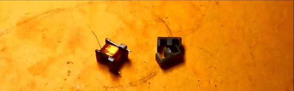 Далее рассмотрим оба варианта. Для того чтобы воспользоваться дросселем из электронного балласта, его надо выпаять из платы и затем разобрать. Если в нем применен Ш-образный сердечник, он содержит две одинаковые части, которые соединены между собой. В рассматриваемом примере для этой цели применена оранжевая клейкая лента. Она аккуратно удаляется.
