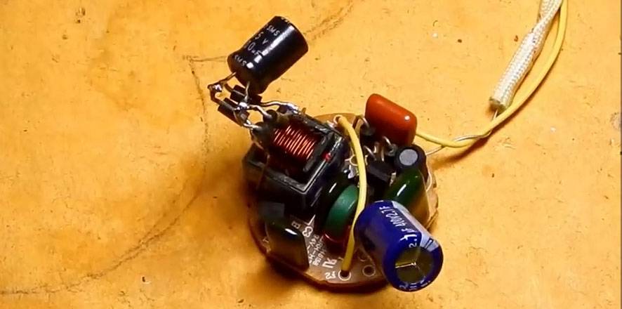 Также в схеме имеется трансформатор с тремя обмотками: основная подает напряжение к лампе, а две дополнительные выполняют открытие ключей на транзисторах.