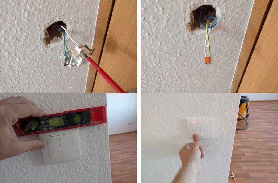 После подготовки штроб питание снимается во избежание поражения электрическим током. Далее, в распределительную коробку заводят провода со щитка, и при помощи алебастра крепят ее в нише. Провода располагают и фиксируют в штробах, затем подключают по указанной выше схеме выключатели. Провод на выключатель из коробки заводится снизу, так что штроба должна проходить ниже него на 5-10 см.