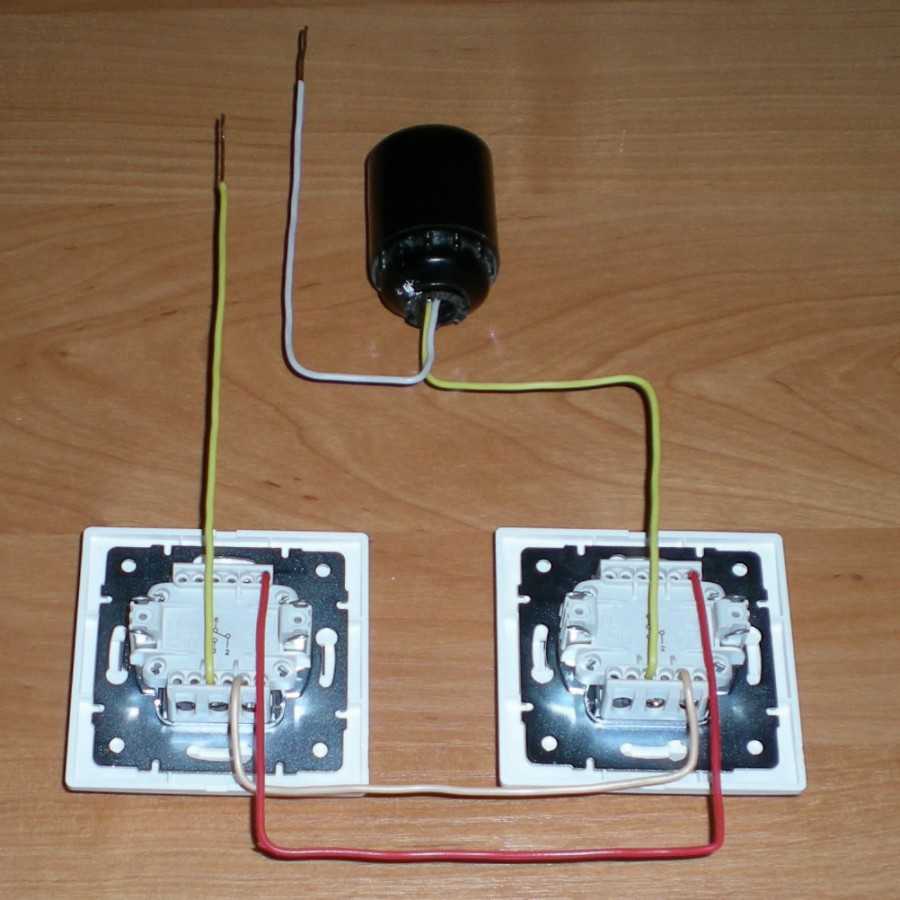 Сначала провода из коробки ведут на выключатели и потребитель, затем выключатели соединяются между собой. Важный момент – не перепутать провода, на выходах выключателей идут два провода перекрестного подключения, на вход первого – фаза, вход второго соединяется с потребителем.