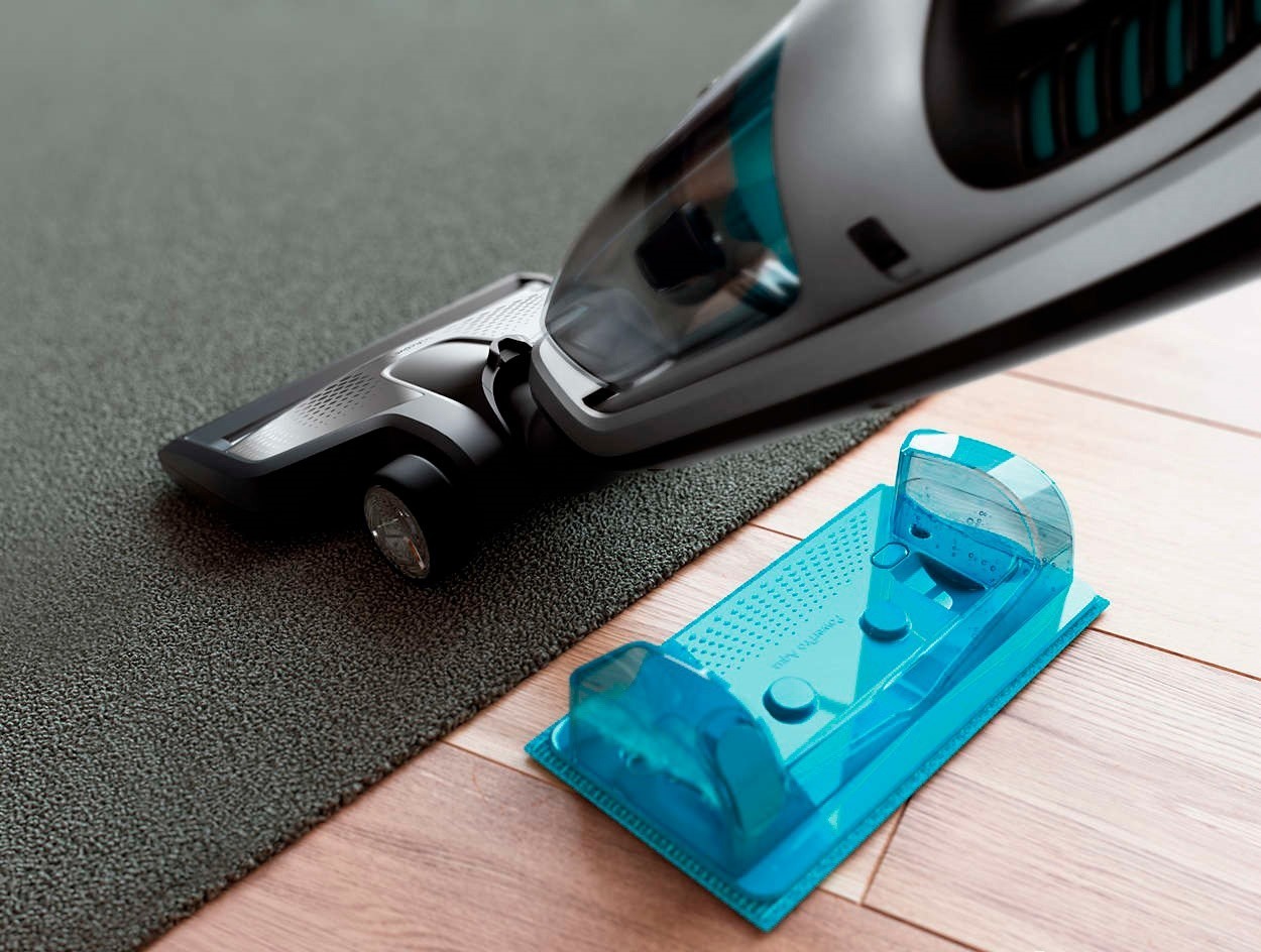 Наиболее эффективен для удаления шерсти от животных с мягкой мебели и ковров, а также сухой уборки с разных видов напольных покрытий. При необходимости трубка отсоединяется, и маневренность и сфера применения увеличиваются. Уникальная система фильтрации задерживает мельчайшие пылинки, аллергены и бактерии, поэтому эта модель — идеальный вариант для людей-аллергиков. Питание осуществляется при помощи аккумулятора типа Ni-Cd. Время работы от батареи – 30 минут, время подзарядки – 330 минут. Сбор пыли осуществляется в контейнер. Его объем – 540 мл. Мощность всасывания – 100 Вт. На корпусе находится её регулятор. Уровень звуковой мощности – 85 дБ.