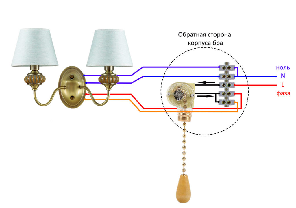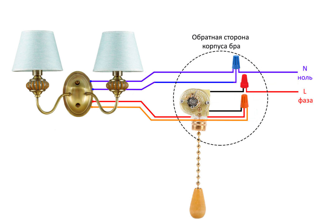 Первой нужно для того, чтобы закрепить сонетку, а второе для того, чтобы вывести шнур, который и будет предназначен для дерганья. Ведь без этой функции бра просто не будет включаться и выключаться. Далее соединяются выходные контакты бра друг с другом.