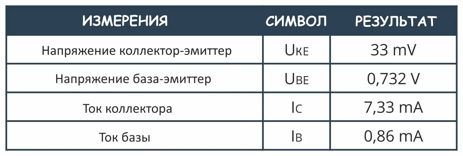 Интерпретация измерений: напряжение коллектор-эмиттер невелико, порядка нескольких десятков милливольт. Это означает, что транзистор вошел в состояние насыщения. Такое происходит, когда через коллектор протекает ток меньший, чем можно было бы судить по коэффициенту β . Давайте проверим, так ли это: согласно документации на этот транзистор, коэффициент находится в диапазоне от 200 до 450. Об этом свидетельствует буква B в конце маркировки, которая также есть на нашем транзисторе. Фрагмент документации: