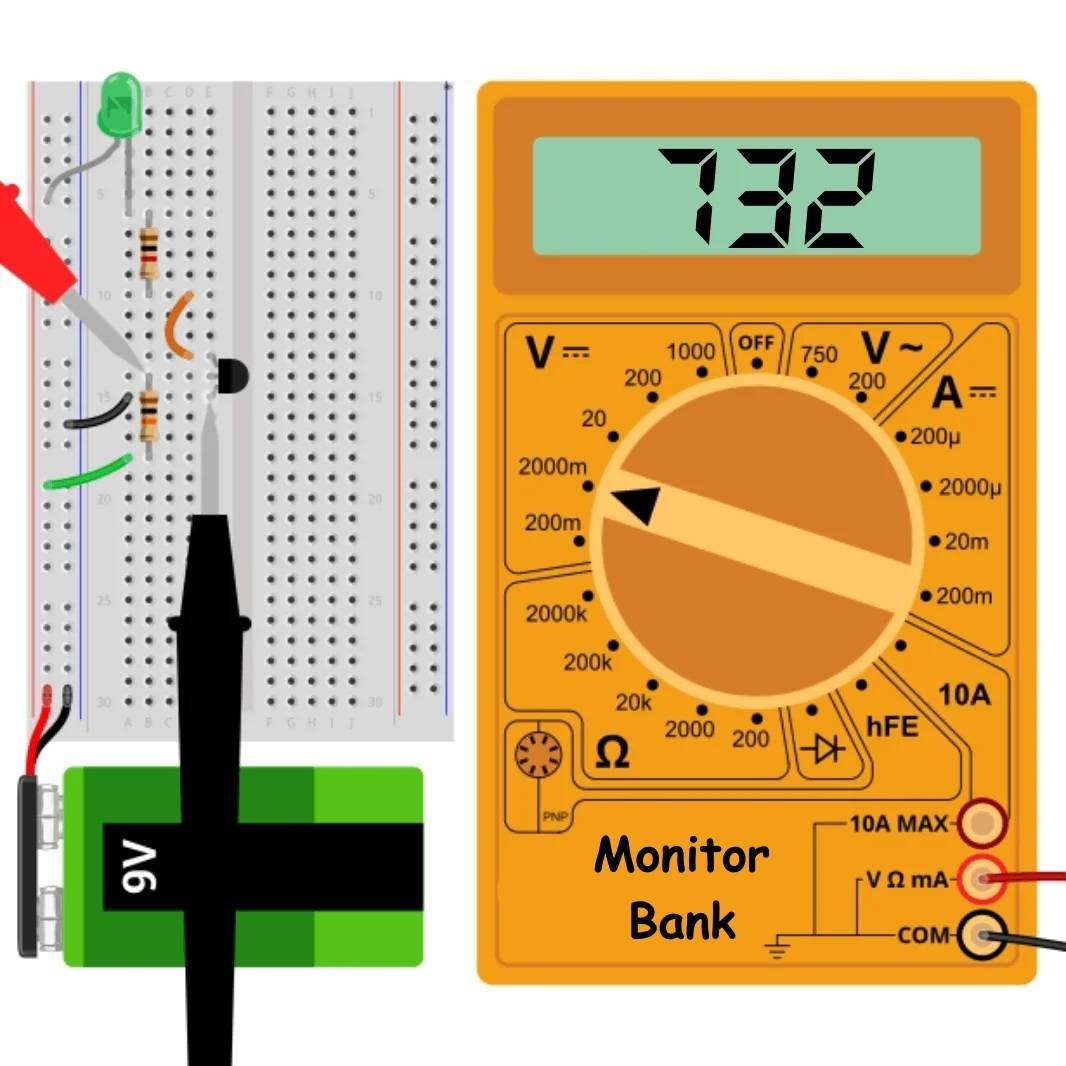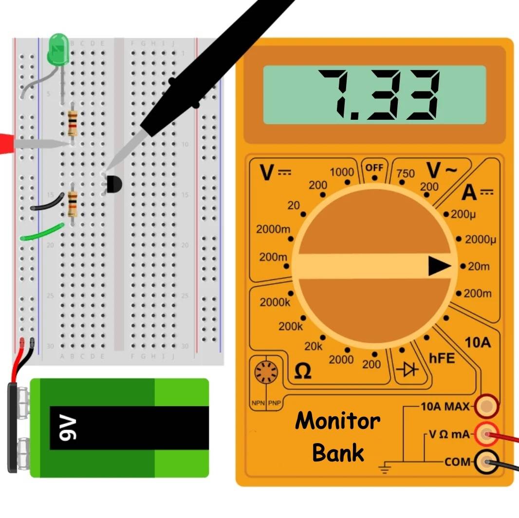 Между тем, через коллектор протекает всего 7 мА. Это потому, что он ограничен резистором 1 кОм. Если бы его не было, через коллектор мог бы протекать гораздо больший ток, но это привело бы к разрушению светодиода, транзистора и (возможно) к повреждению батареи.