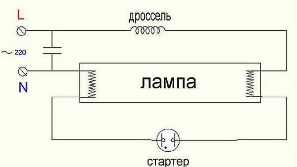 Стандартная схема подключения люминесцентной лампы включает в себя сам источник освещения, стартер и дроссель.