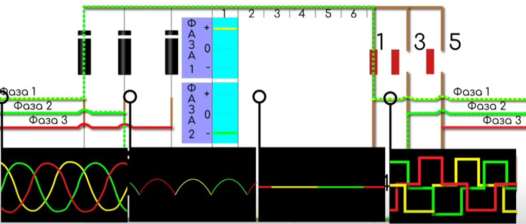 — Импульсного инвертора. Силовой трехфазный инвертор обычно имеет шесть транзисторов-ключей и осуществляет преобразование тока до заданных частот и амплитуд, а затем подает его на статор. Инвертор может состоять из тиристорной схемы.