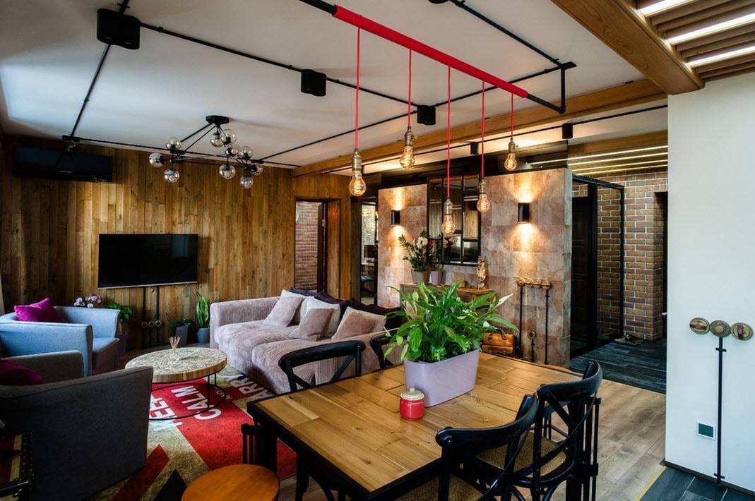 Гостиная и кухня в стиле лофт также могут быть декорированы свисающими с потолка лампами. Сделать такое освещение можно своими руками, не обязательно обращаться к профессионалам. Для этого необходимо подобрать в магазине подходящую по форме и размеру лампу. Также понадобится стилизованный под старину провод. Провода бывают разных цветов и толщины. Патрон может быть в металлическом или керамическом исполнении, какой выбрать, решать вам. Если есть элементарные знания электрики, то собрать самостоятельно элементы освещения не составит труда. Если такие навыки отсутствуют, лучше обратиться к специалистам.