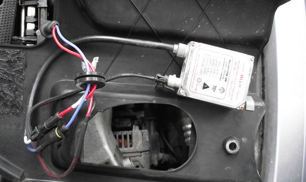 2) Сложное оборудование. При установке нужно устанавливать сложное оборудование. Для того чтобы зажечь лампу нужно напряжение в 20 — 25 000 В, а затем нужно поддерживать «горение» с напряжением в 40 – 60 В (с частотой 300 Гц). Штатная система автомобиля никогда не выдержит такого напряжения, поэтому устанавливаются «блоки розжига». А они громоздкие, не умещаются в штатную фару, крепятся снаружи, иногда на лонжеронах.