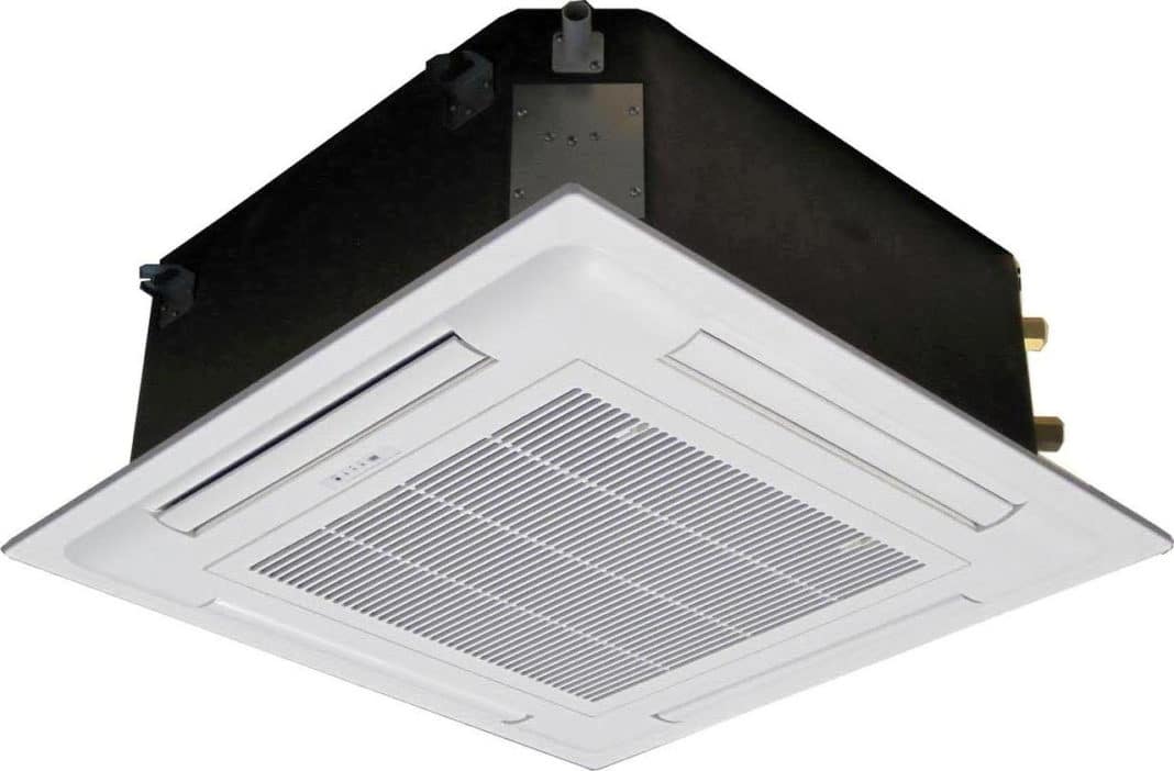 Потолочные аппараты наиболее популярны и имеют 2 варианта исполнения: кассетные и канальные. Первые монтируют в объемных помещениях с подвесными потолками. За подвесной конструкцией располагают корпус. Видимой остается нижняя панель. Они могут рассредоточивать воздушные потоки по двум или всем четырем сторонам.
