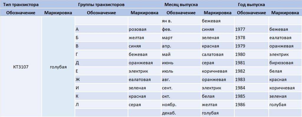 В таблице ниже представлена цветовая маркировка транзисторов: