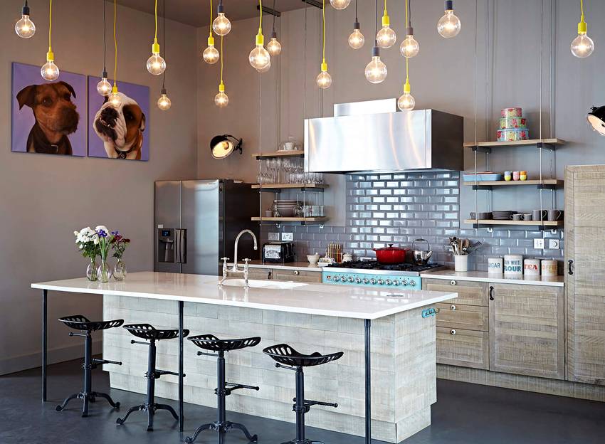 - Если есть возможность, можно использовать и подвесные светильники (как правило, их размещают над столом при островной планировке). Однако учтите, что это, пожалуй, самый дорогостоящий вариант.