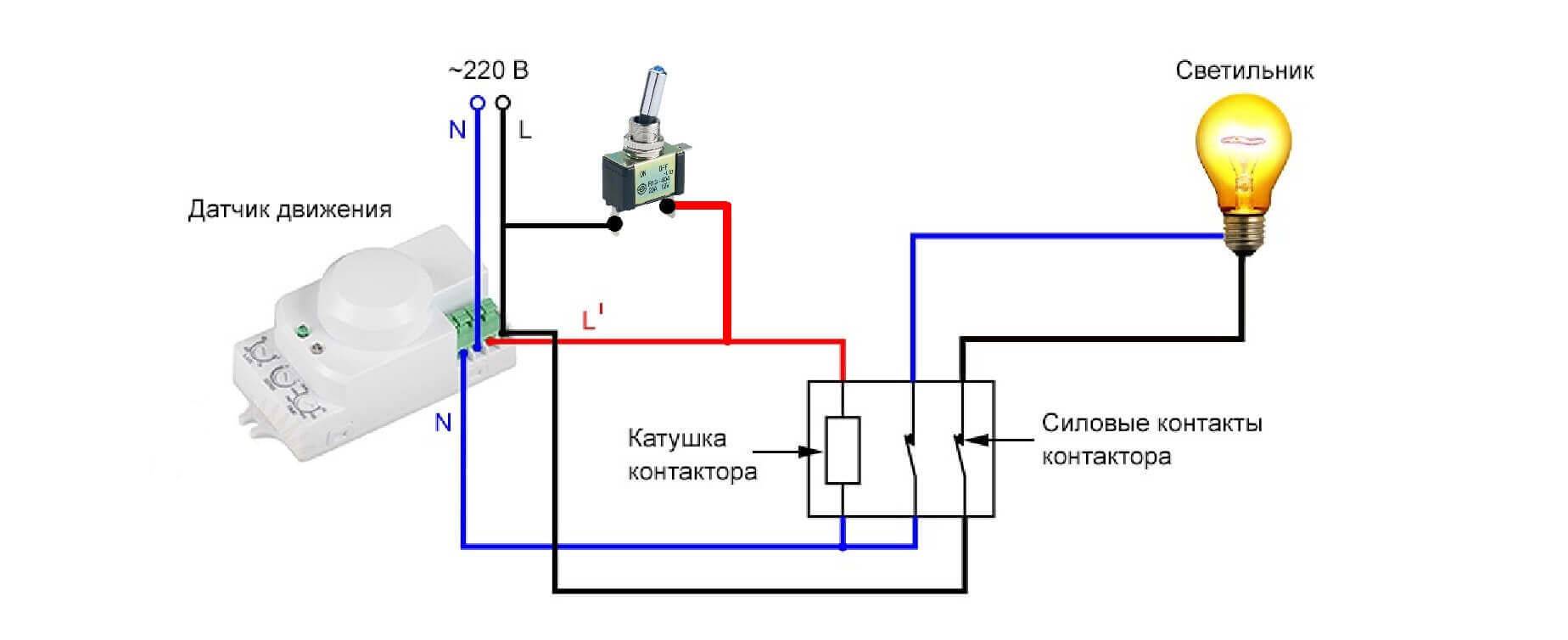Если мощность устройства недостаточна, то светильники можно включить через реле или пускатель.