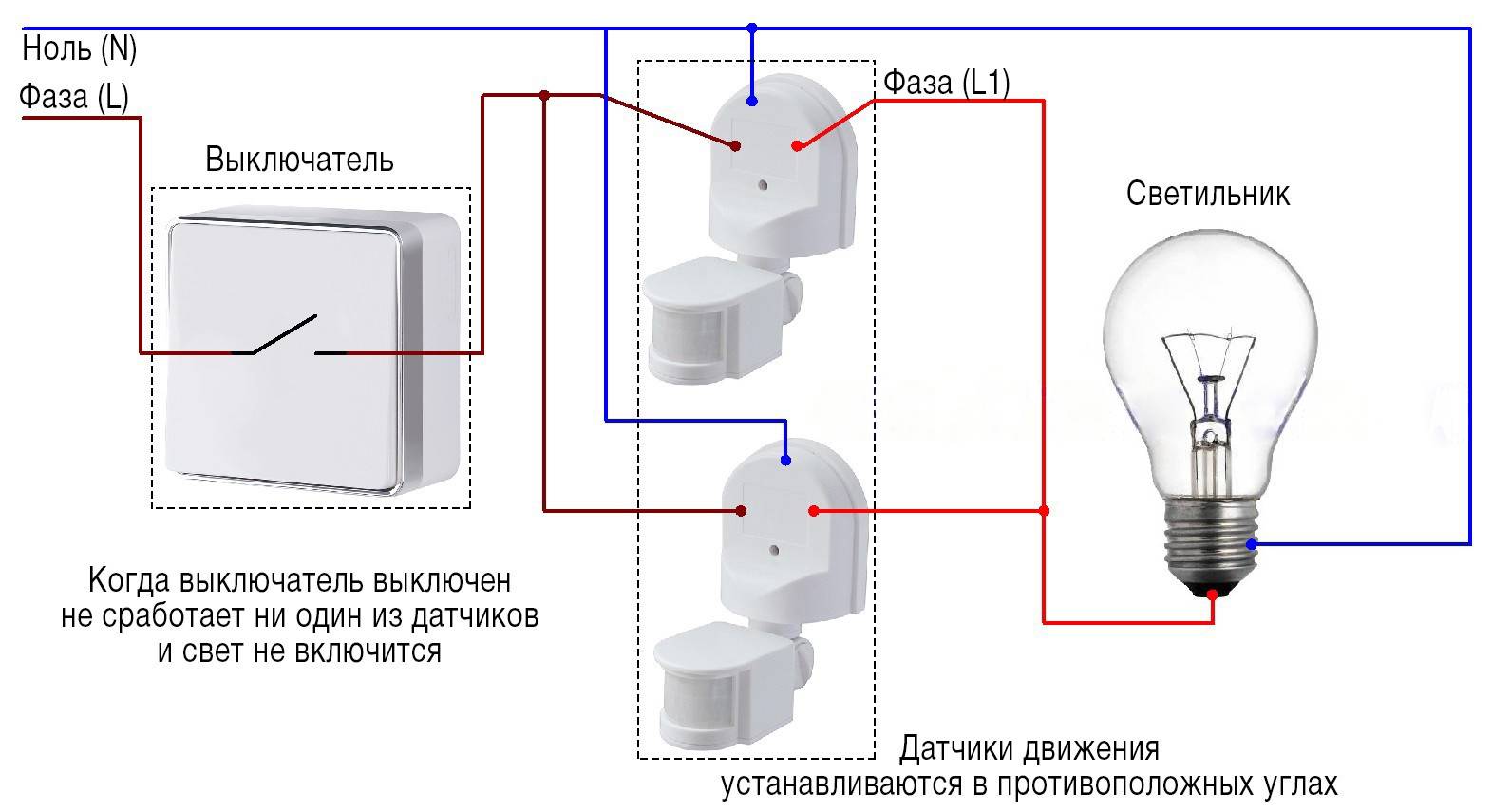 Если у вас длинный коридор, с поворотами и т.д., то лучше всего установить несколько датчиков, которые будут активировать освещение, пока вы находитесь в зоне их видимости, для этого, предпочтительнее выбрать параллельную схему подключения. Количество приборов неограниченно.