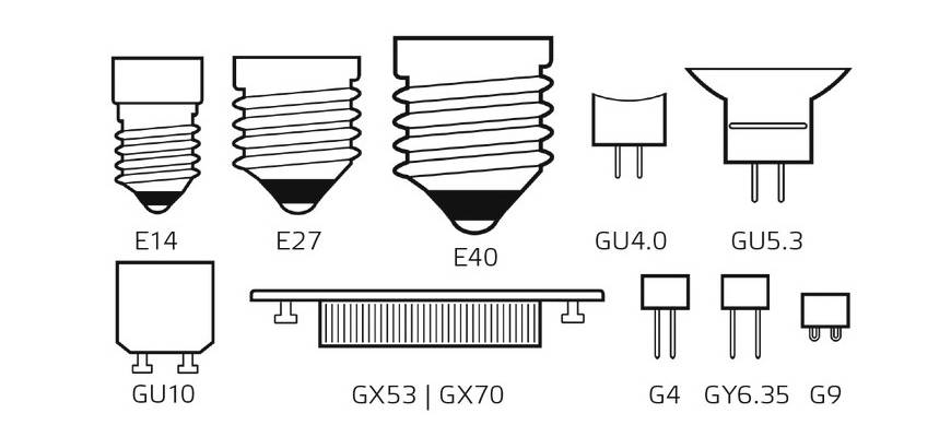 - E – стандартный вариант с винтовой резьбой, разработанный Т. Эдисоном;