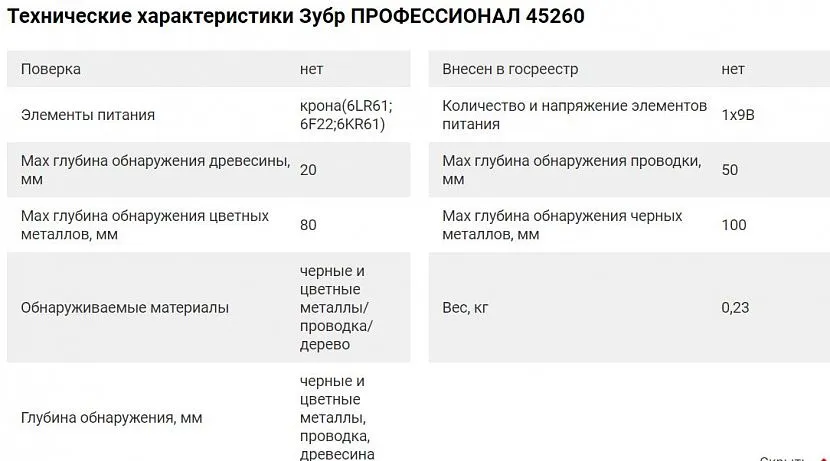 По внешнему виду и описанию технических характеристик прибора, его можно назвать братом-близнецом модели ADA instruments Wall Scanner 80. Единственное отличие заключается в синем цвете корпуса и других глубинных параметрах. По описанию производителя, «Зубр» «достаёт» черный металл на глубине 100 мм, а цветной – 80 мм. В сравнении с вышеупомянутым собратом, значения превосходят на 20 мм для каждого пункта.
