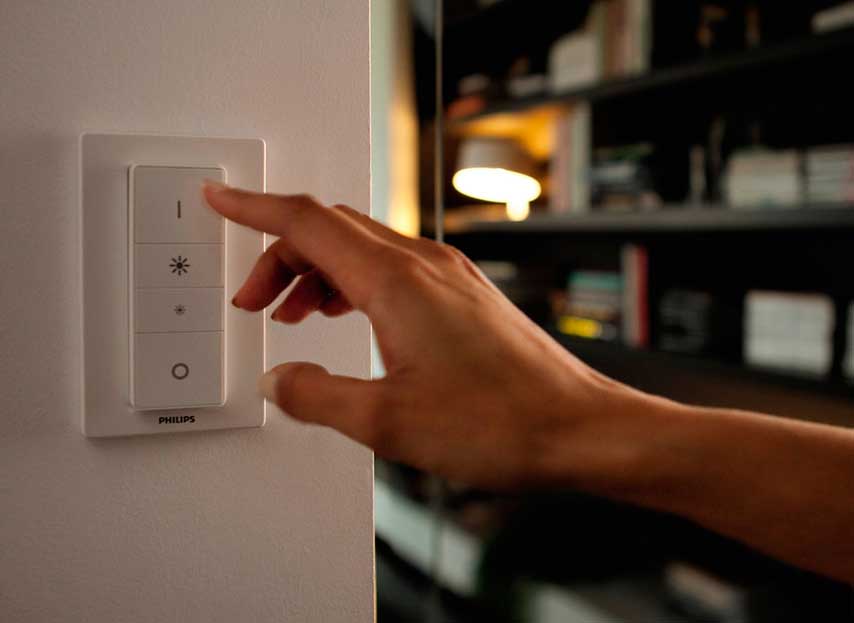 Проще всего подключать диммированные лампы со встроенным блоком электроники и отдельным пультом ДУ. Ими заменяют имеющиеся источники света без вмешательства в электрическую схему. Так как светодиодные источники света потребляют не много электроэнергии, то не понадобятся более мощные защитные автоматы, другая проводка.