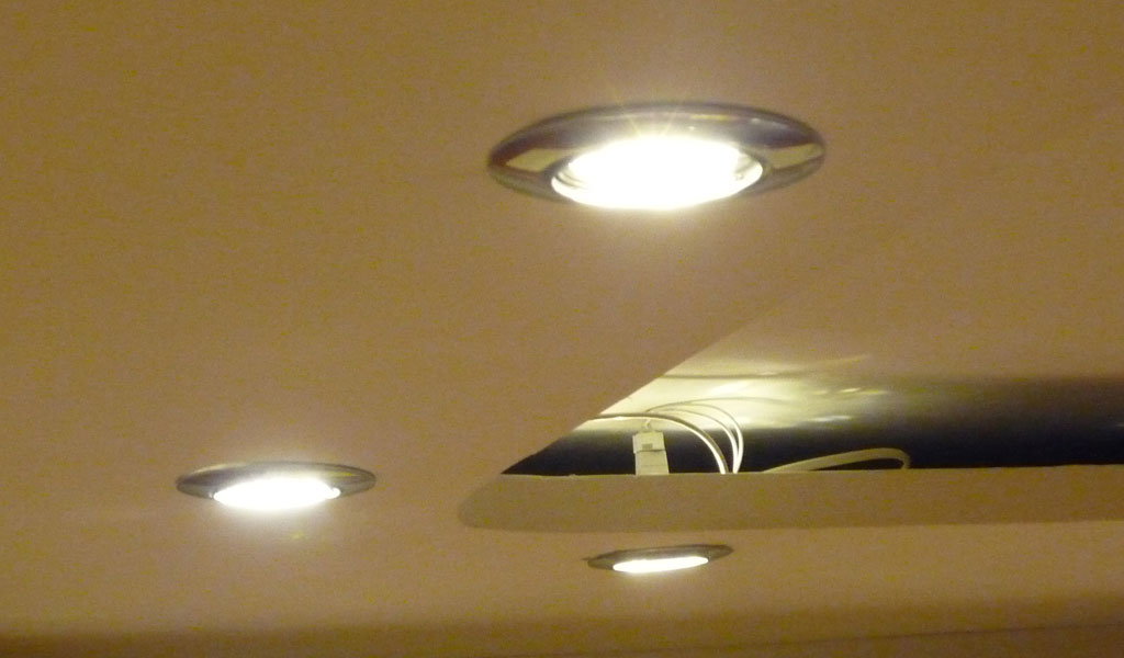 - Точечные. Подобные изделия устанавливаются в натяжные или подвесные потолки, корпусную мебель для создания дополнительного или основного освещения. Они создают довольно большой угол распространения света – до 100°.