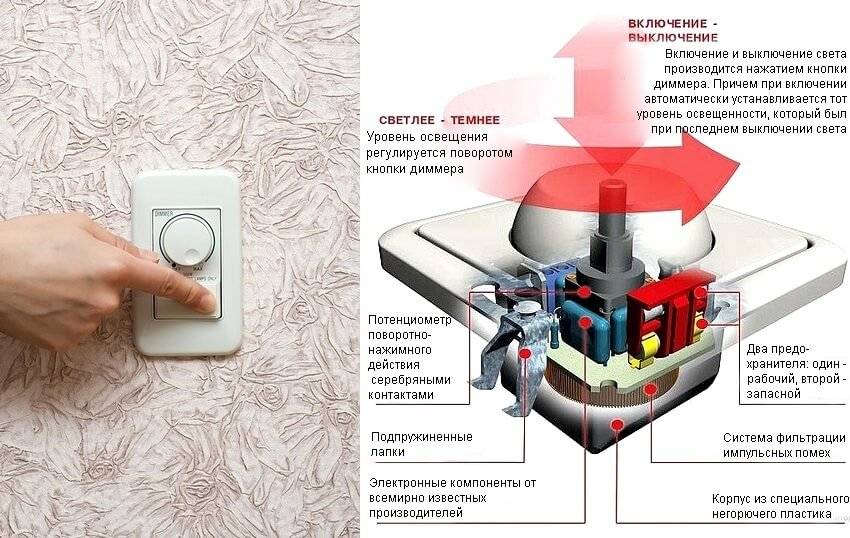 Некоторые модели качественных выключателей оснащаются не только вращающейся ручкой-регулятором, но и маленькой клавишей, с помощью которой можно включать и выключать свет при настроенной яркости. Есть также диммеры с большим переключателем. Они работают так: длительное нажатие при включенной клавише меняет яркость освещения до заранее настроенного на ШИМ-контроллере минимального или максимального значения. Чтобы остановиться на выбранной интенсивности свечения лампы, надо снять руку с клавиши. Такие модели удобны тем, что при включении лампы яркость света останется такой же, какой была до выключения.