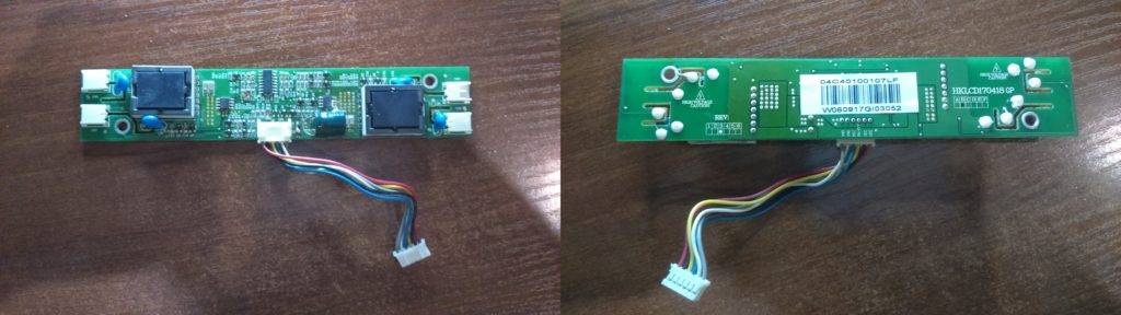 Плата инвертора с блоком питания имеет лишь один разъём подключения для коннекта с платой контроллера матрицы. Зная, какие контакты есть на выходе этой платы и платы внешнего инвертора, мы можем соединить их проводами.