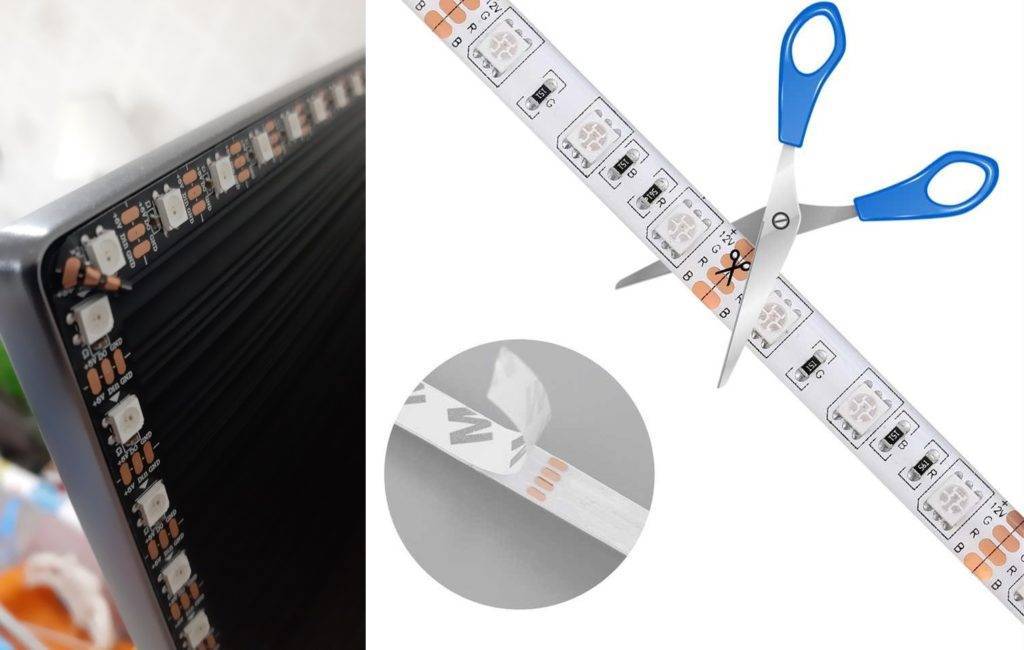 Сама светодиодная лента крепится на клеевую основу, скрытую под защитной пленкой, таким образом, чтобы в углах находилась контактная линия. При необходимости, по этой же контактной линии можно обрезать излишки, как указано на изображении. Далее к LED ленте подключается блок управления и конечно же блок питания.