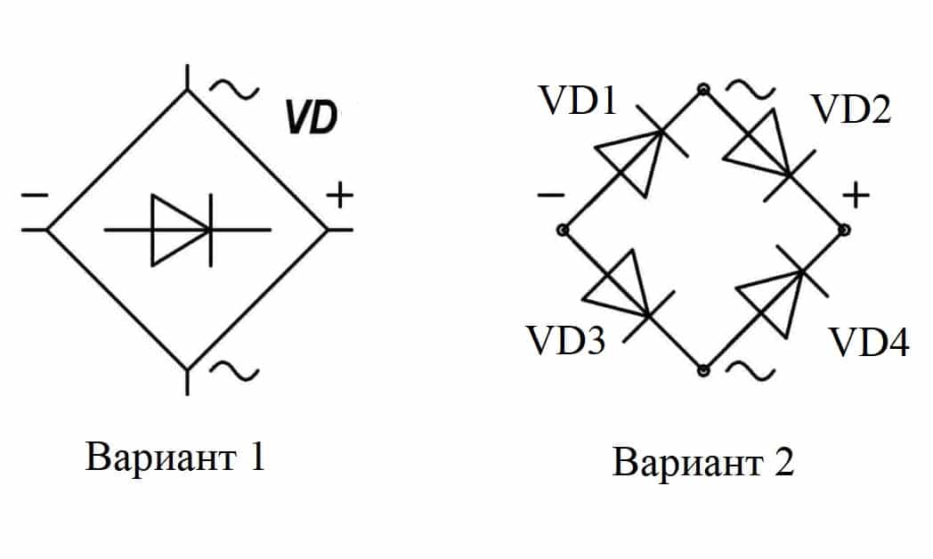 Второй вариант наиболее распространен для тех ситуаций, когда диодный мост состоит из отдельных полупроводниковых устройств, собранных в одну схему. Маркировка второго варианта, чаще всего, выполняется в виде ряда VD1 – VD4.