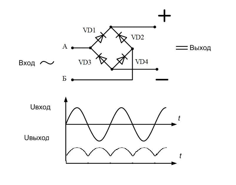 - На вход выпрямительного моста, обозначенного буквами А и Б подается переменное напряжение 220В.