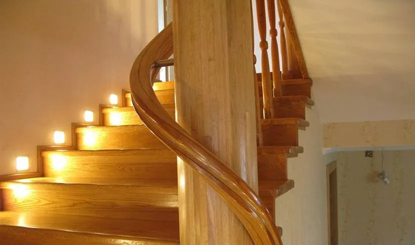 Для освещения деревянной лестницы необходимо пользоваться лампами, не выделяющими тепла