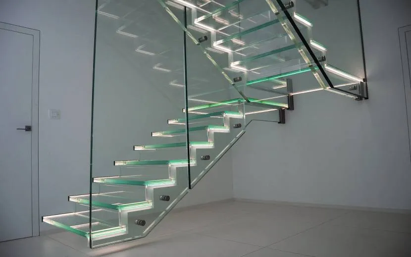- На больцах – она кажется невесомой, словно подвешенной в воздухе. Ступени крепятся всего лишь в нескольких точках. Подступеней у таких лестниц нет, потому они и выглядят прозрачными;