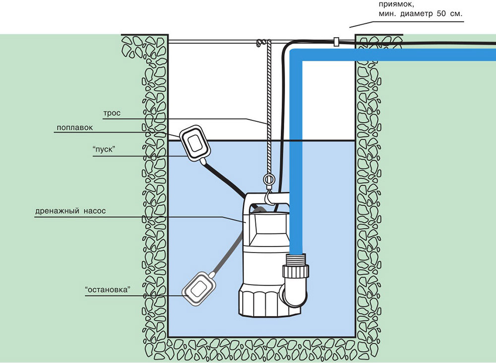 - Насосный узел, имеющий заборный патрубок. Для того чтобы грунтовая вода могла поступать в систему откачки насос подключается к трубе, которая опускается в подтопленную зону или резервуар.