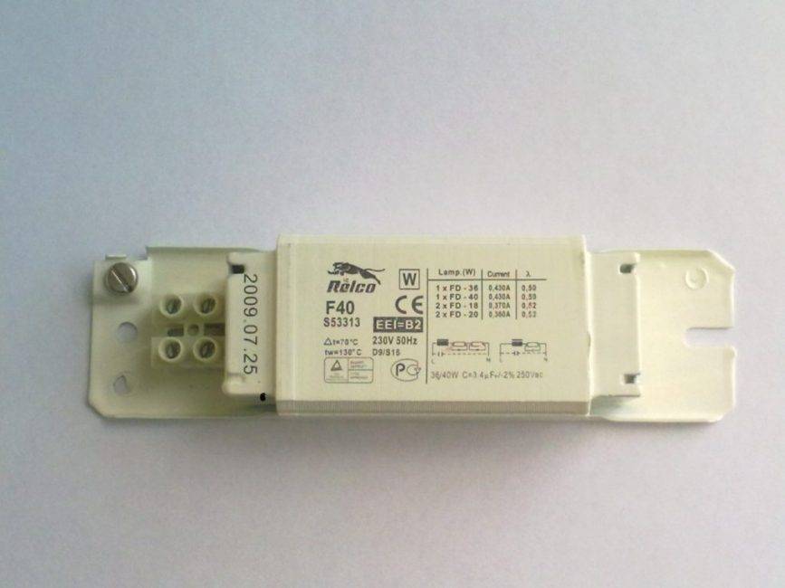 Он имеет вид небольшого блока с выведенными клеммами. Внутри такого блока размещена печатная плата. На ней собрана вся система. По ней можно понять, сколько люминесцентных ламп к ней можно подключить.