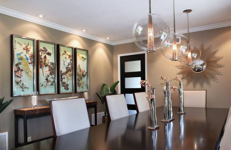 Если гостиная совмещена со столовой, следует учитывать, что по отдельности оба этих помещения освещаются по разным схемам. А значит, необходимо организовать неравномерную подсветку: в столовой – более яркий свет, в гостиной – умеренный, чуть приглушенный. Идеальным решением является использование автоматического управления каждой из выделенных зон.