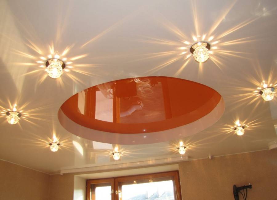 Точечные приборы сочетаются с натяжным полотном. Их монтируют как основное освещение, так и дополнительное. Этот тип применим в комнатах со стандартной высотой. Монтаж светильников выполняют: