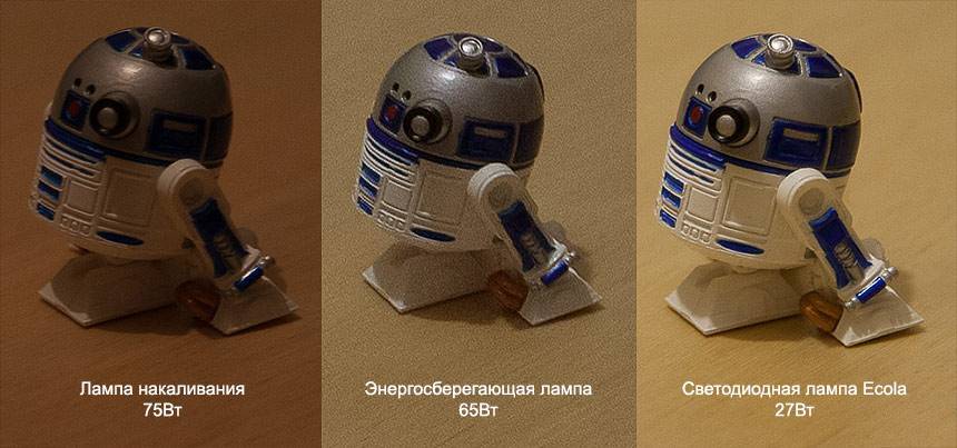 Затем я сделал три снимка. Первый – с 75-ваттной лампой накаливания, освещающей героя, второй снимок – с энергосберегающей лампой и третий – со светодиодной лампой Ecola Premium.