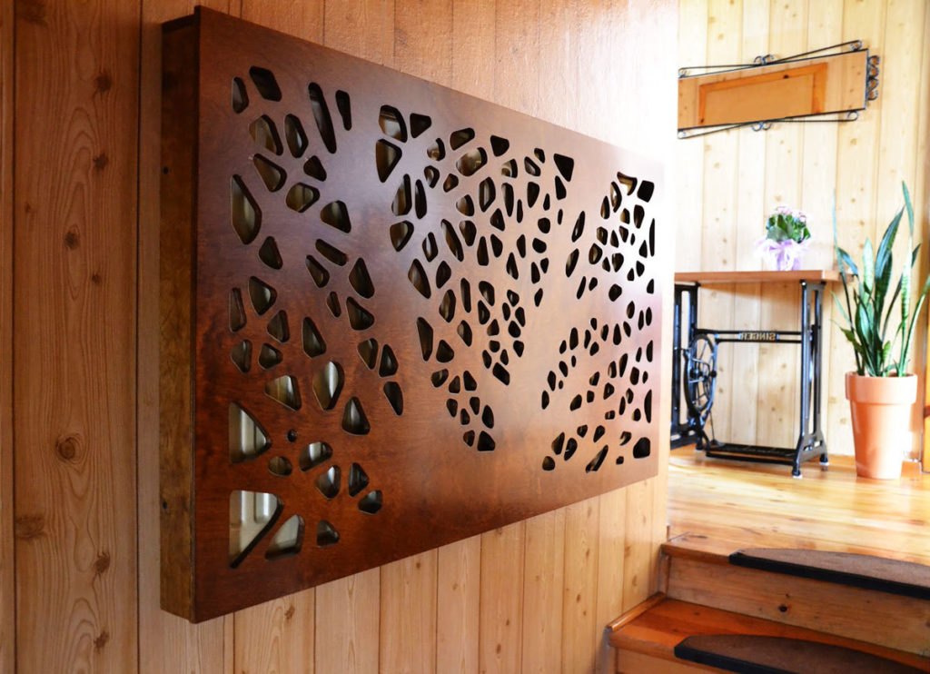 Доступным вариантом являются панели из МДФ. На таких плитах создается огромное количество и зображений. Правильным вариантом выбора станут решетки, имеющие большие отверстия. Цена их будет значительно ниже — экран из МДФ выносливее по отношению к механическим нагрузкам, чего не скажешь о товарах из дерева. У материала прекрасная проводимость тепла и высокая выносливость к температурным перепадам. Эти изделия легко устанавливать и демонтировать.