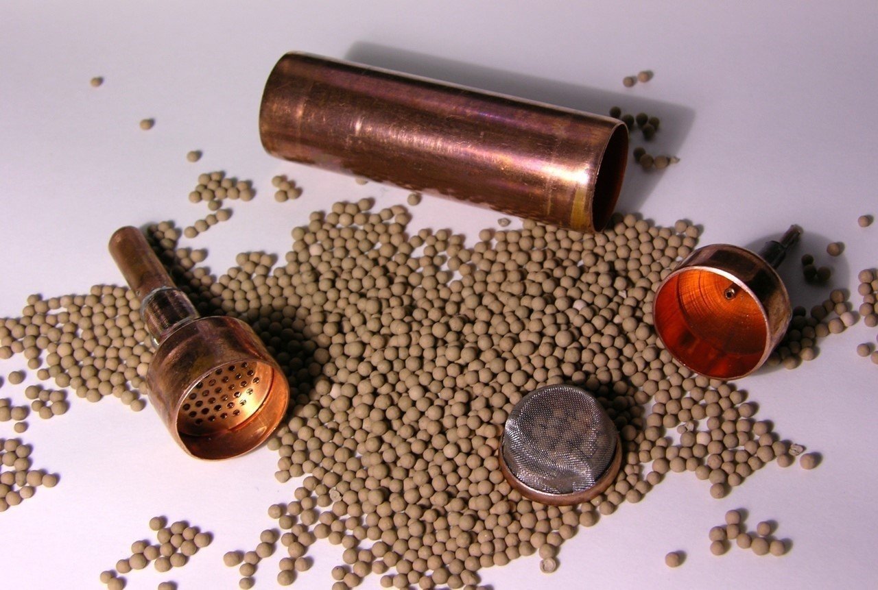 Внутри трубки находится цеолит — минеральный наполнитель с высокопористой структурой. На обоих концах трубки установлены заграждающие сетки.