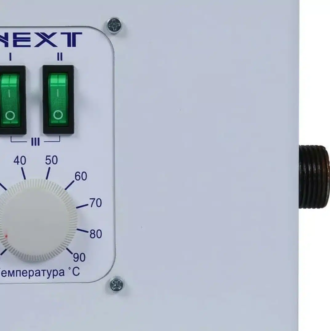 Первый включает на 1/3 мощность, другой – на 2/3. Если включите их вместе, мощность будет полной. С помощью электрического котла для отопления Evan Next 5 можно подключить теплый пол. Для комфортного безопасного управления в него встроен блок, защищающий от перегрева. У котла внешнее подключение.