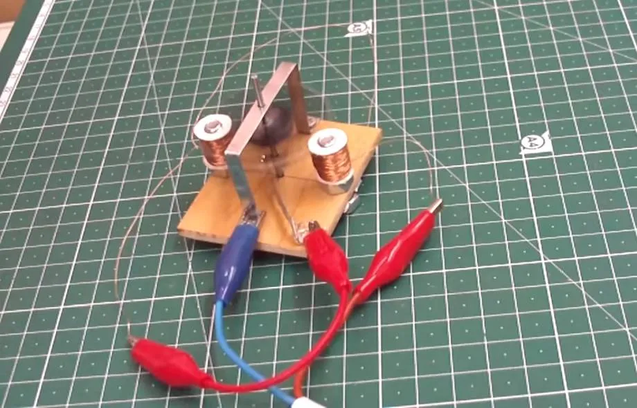 - Контакты электромагнита зачищаются и подключаются к части контактов толстой медной проволоки, закрепленной на деревянном основании.