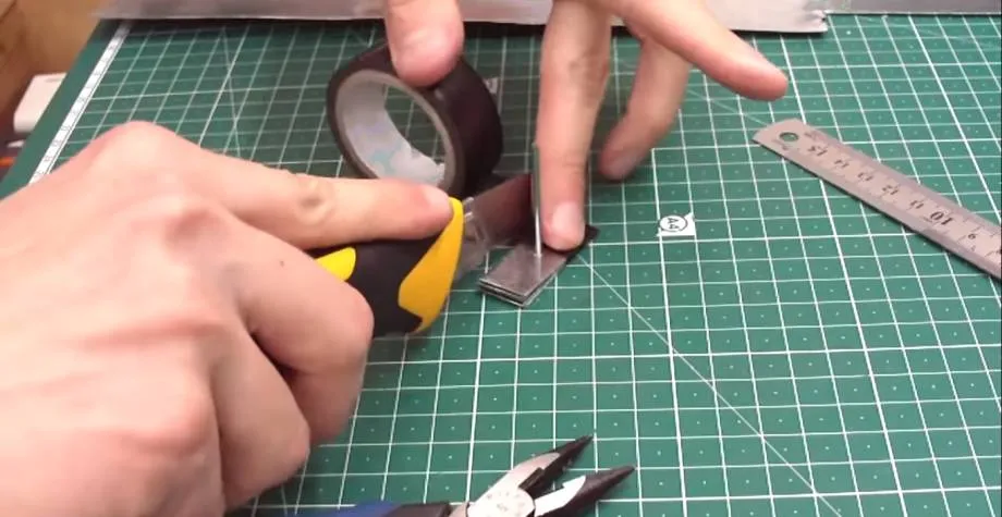 Вырезаем из листа металла пластины размером 7 на 2,5 см и сверлим в центр пластин отверстие под металлическую проволоку, что будет служить осью.