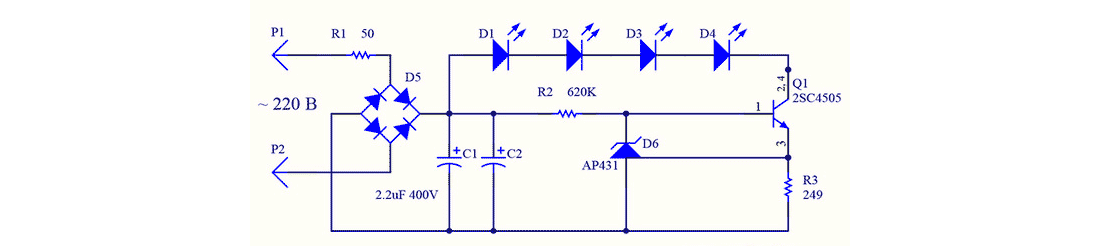 Для дальнейшего анализа причины отказа с печатной платы драйвера срисовал электрическую принципиальную схему филаментной лампы. Как видно из схемы, она практически не отличается от стандартной схемы светодиодной лампы, собранной на обыкновенных светодиодах с токоограничивающим конденсатором.